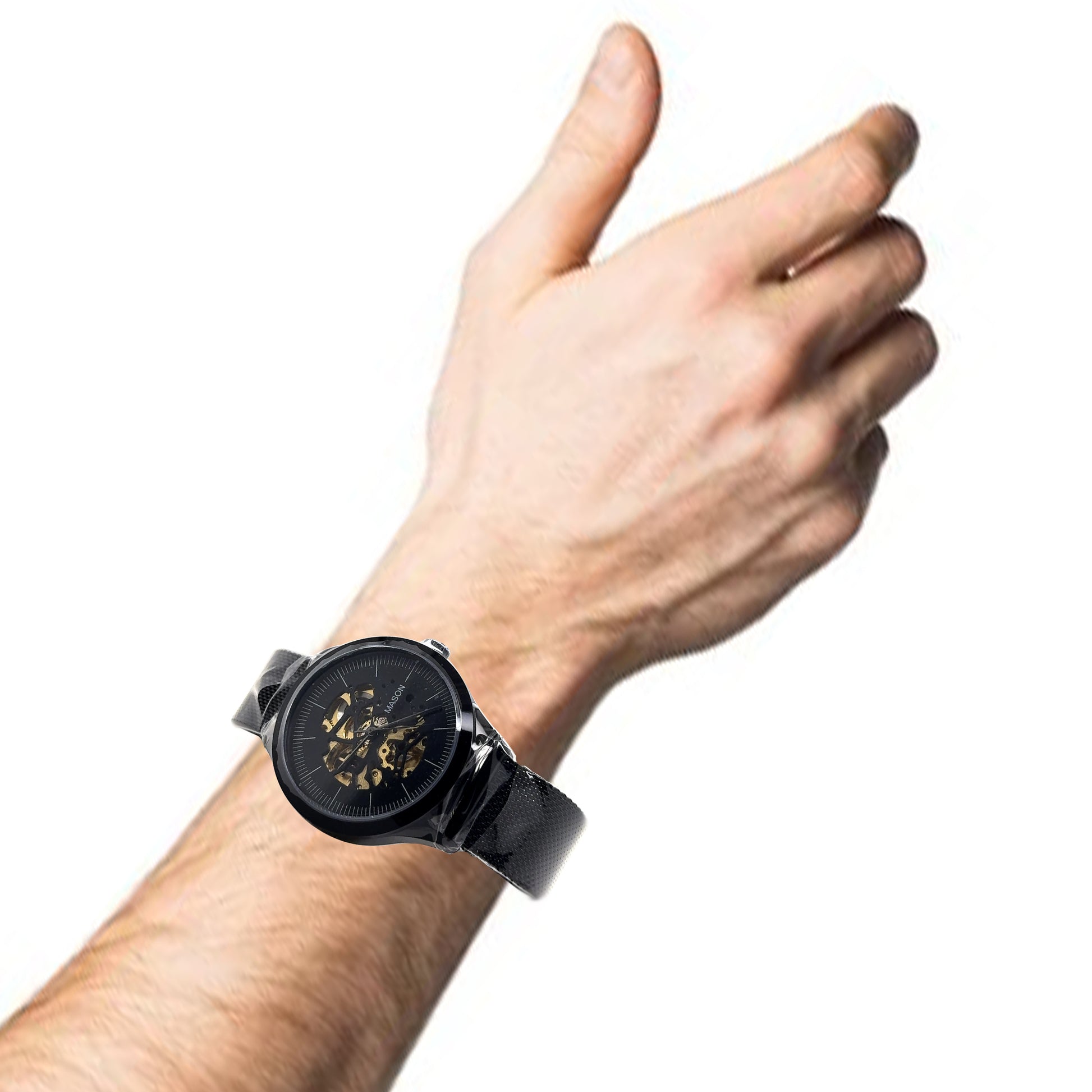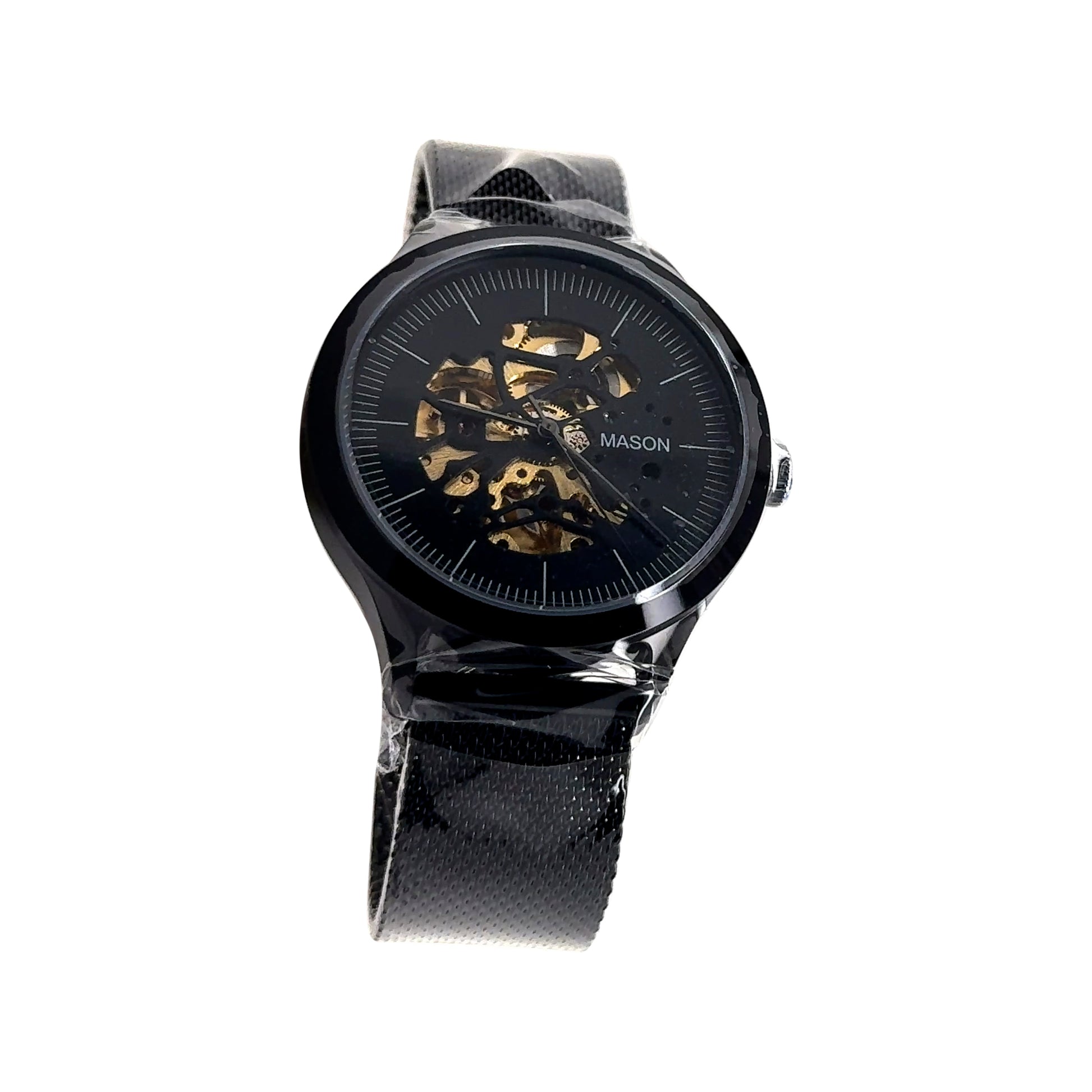Mason Men's Stainless Steel Black IP-Plated Skeleton Movement Mesh Wrist Watch