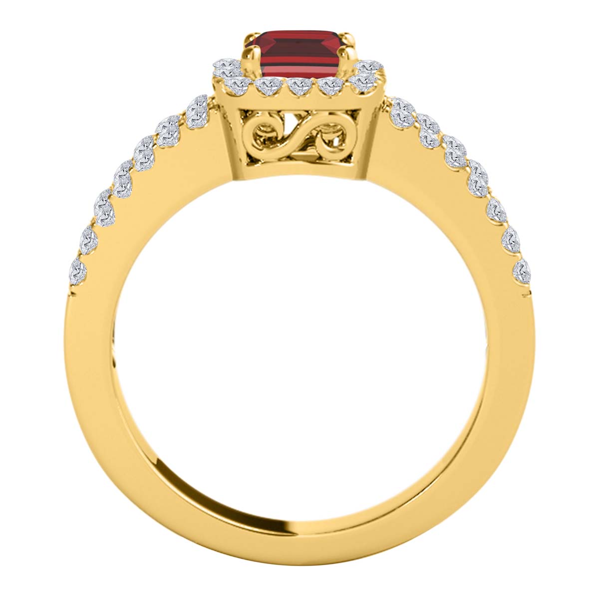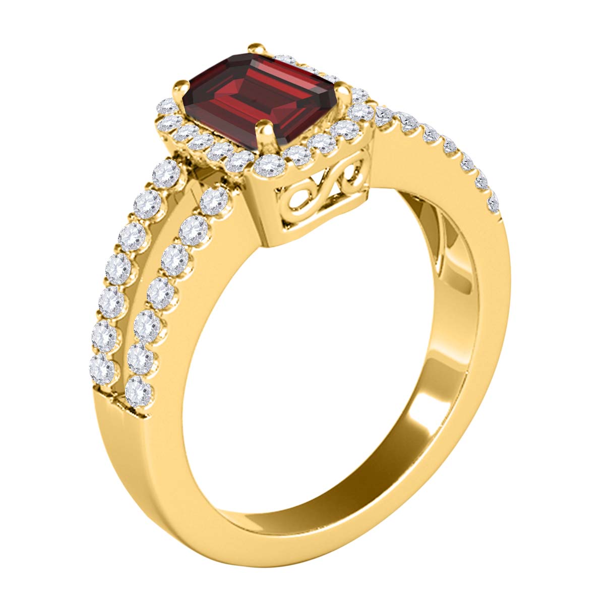 • 2.77 Carat Total Weight Ring: Features 2.25 Ct emerald-cut Garnet center stone with 0.52 Ct lab grown diamond accents (53 stones total).