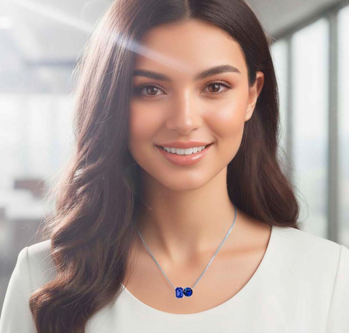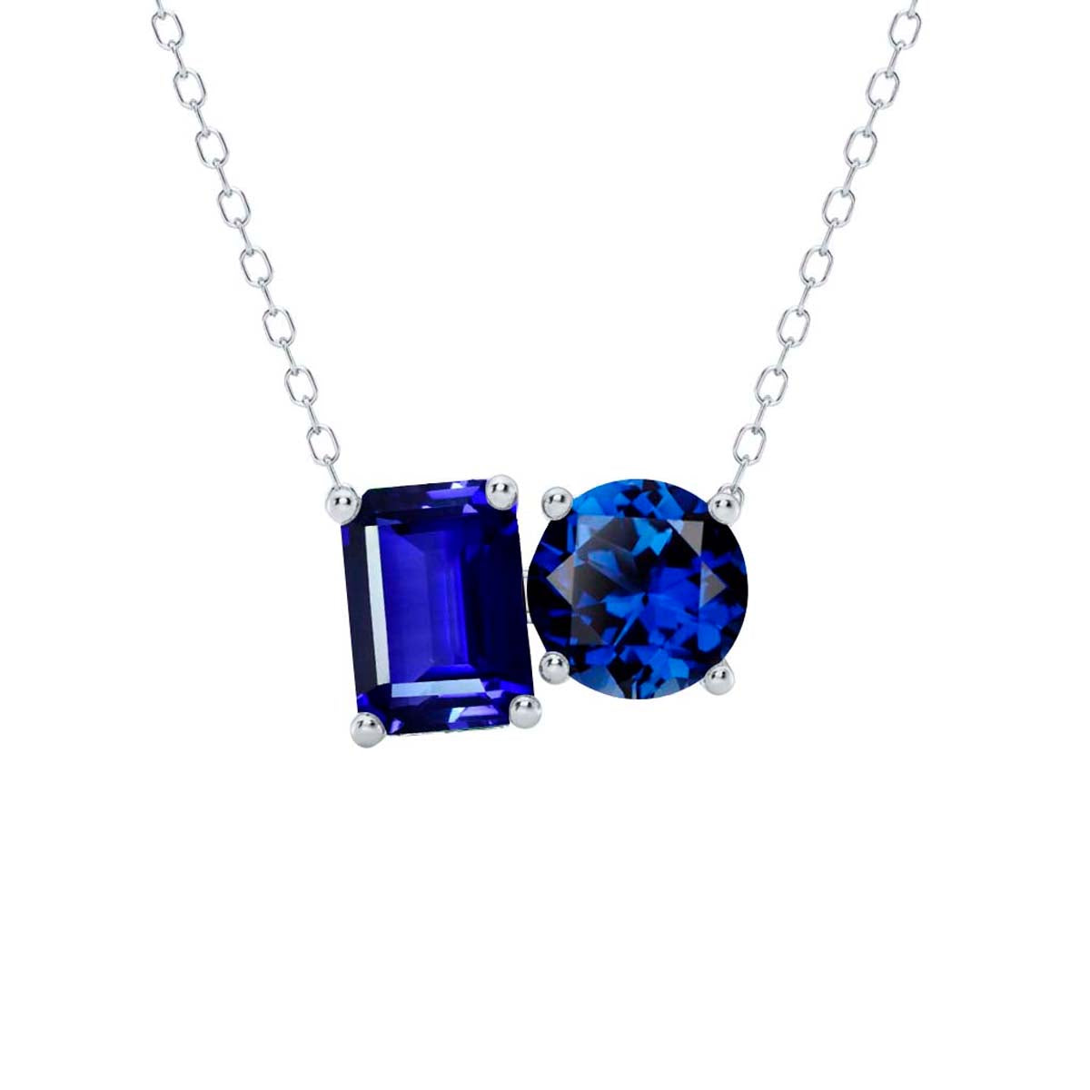 The Mauli Jewels 3.00 Carat Toi Et Moi Pendant Necklace captures the beauty of balance and connection through two radiant lab created sapphire's, each weighing 1.50 carats. One stone features a 7mm round cut, while the other displays an elegant 8x6mm emerald cut, showcasing rich green tones with AAA color for vibrant brilliance.