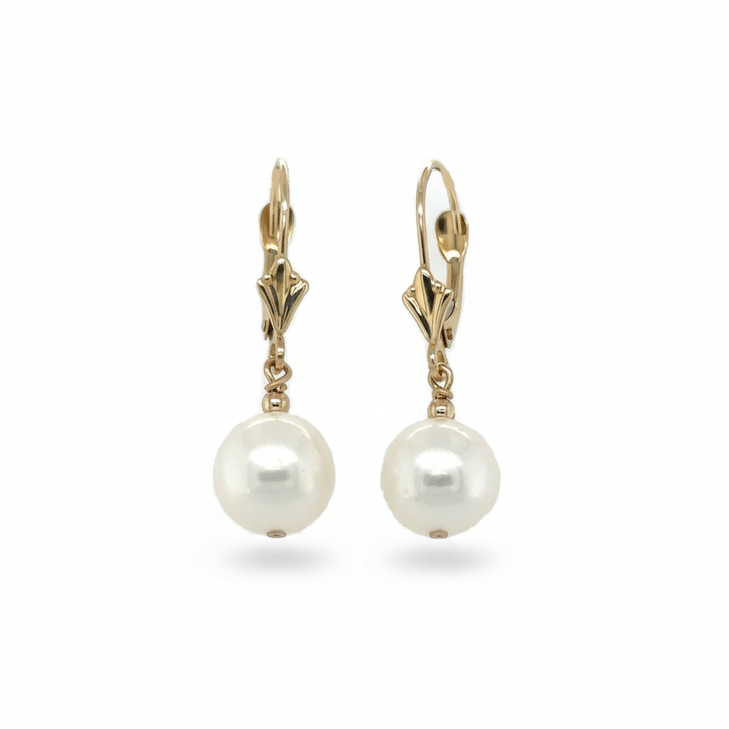 Mauli Jewels 14K Yellow Gold Leverback Earrings with Genuine 8.5MM White Pearl for Women, Classic Dangle Drop Earrings, Elegant Bridal Wedding Anniversary Jewelry Gift