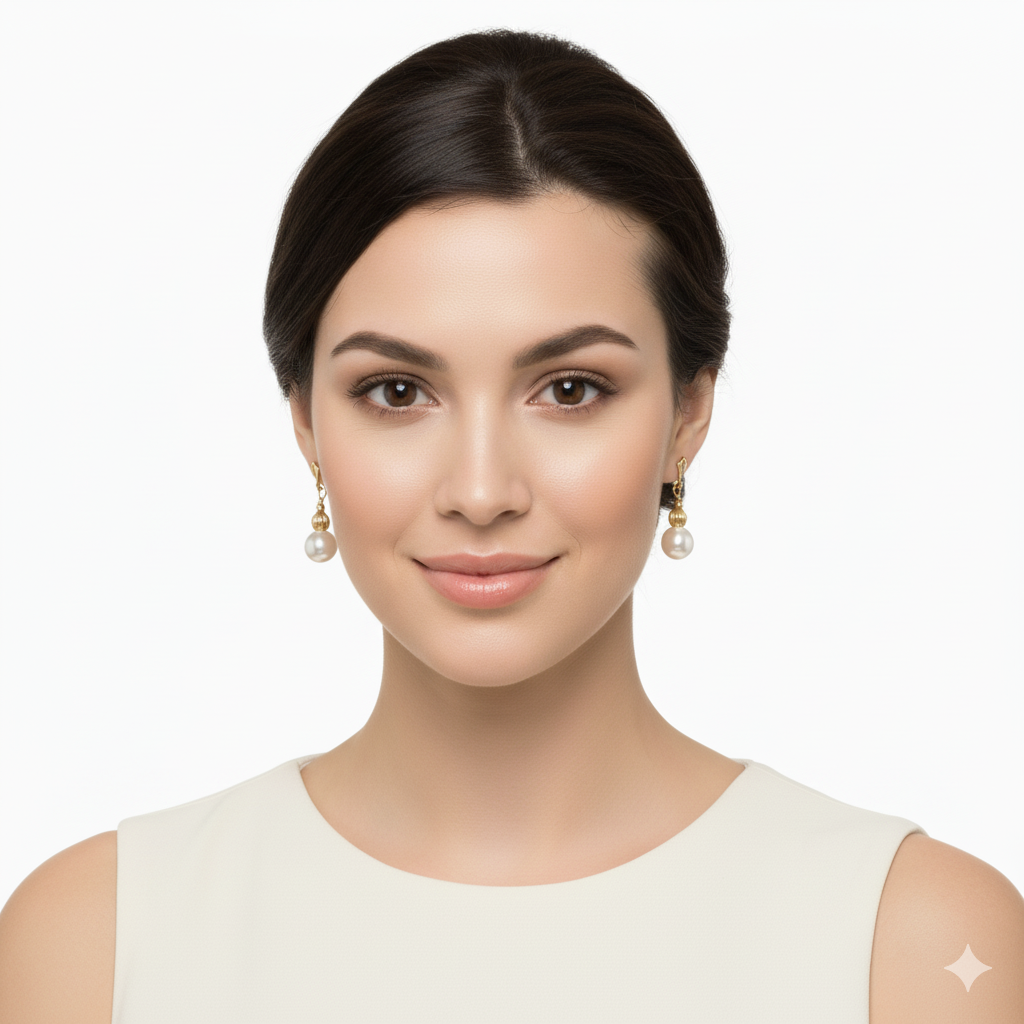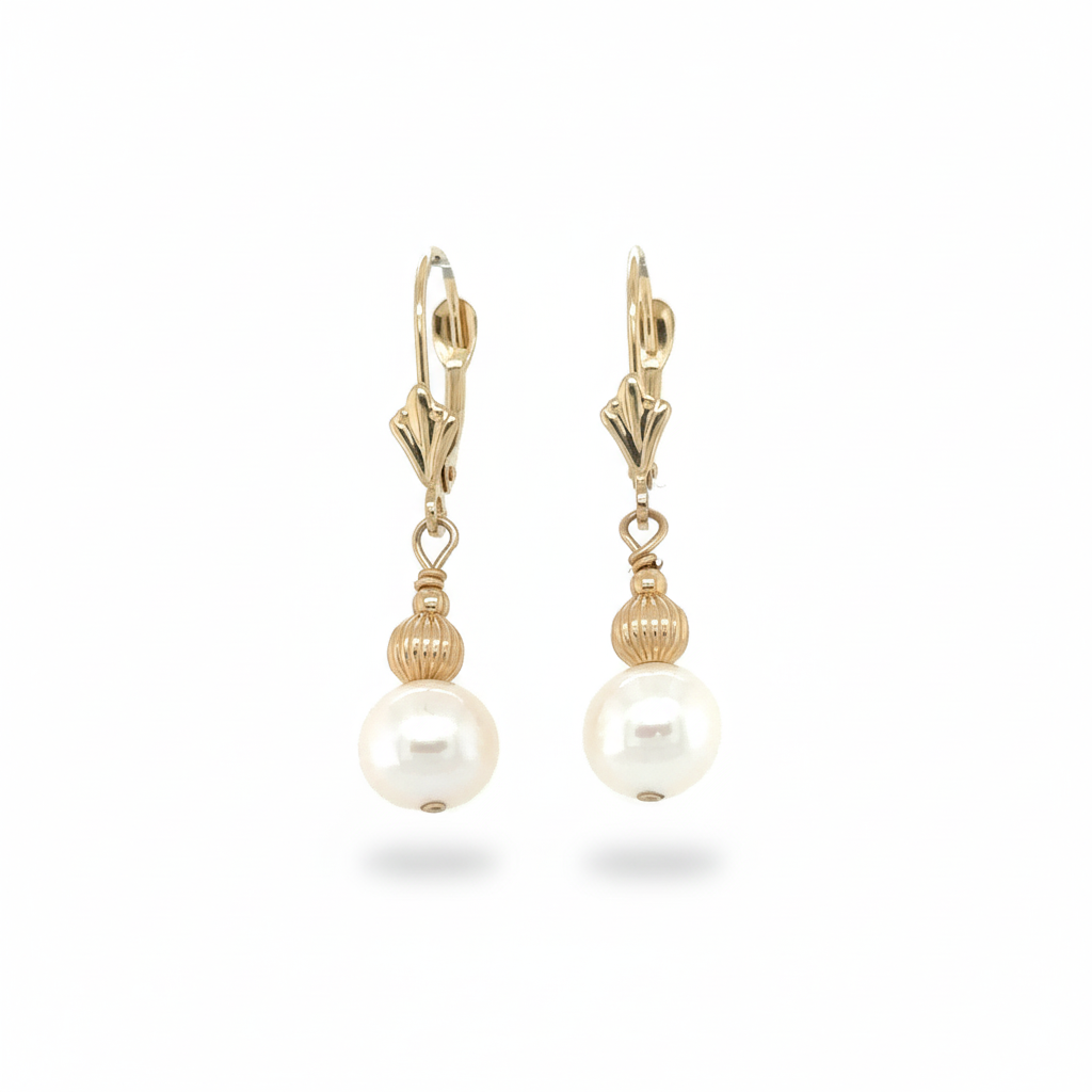 Mauli Jewels 14K Yellow Gold Leverback Earrings with Genuine 7MM White Pearl for Women | Elegant Dangle Drop Earrings, Classic Bridal Wedding Anniversary Jewelry Gift
